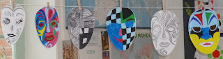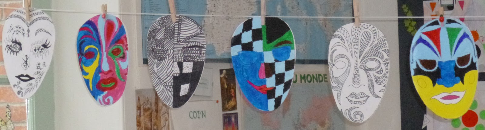 Quelques productions des élèves du cycle 3: masques en mode "recto-verso/couleurs-noir et blanc"